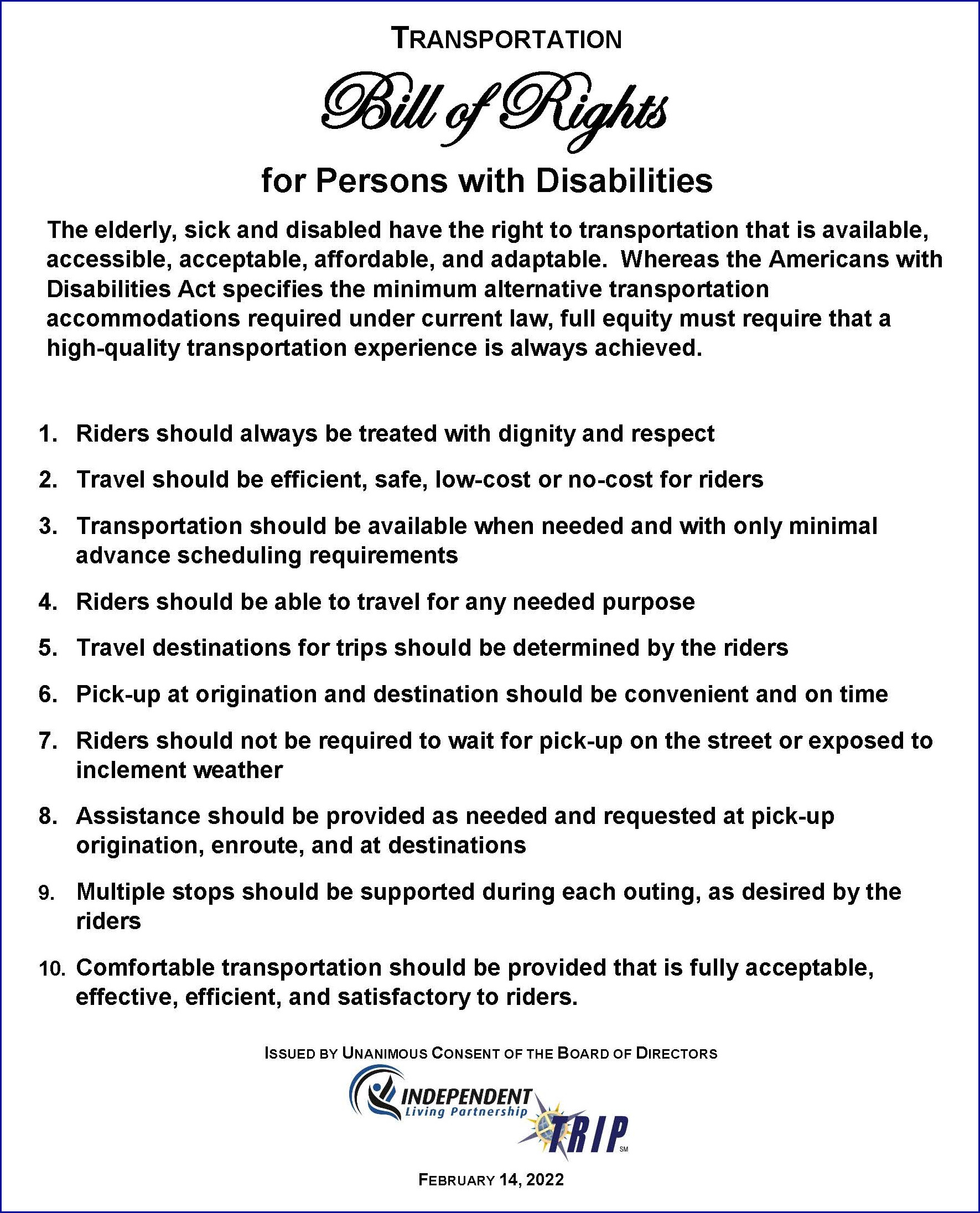 Ivet Woolridge, Chief Operating Officer of ILP says “We know there are people with disabilities and elderly and others for whom transit, paratransit, Lift and Uber do not work because they are our ILP-TRIP clients.” Woolridge says that there are older adults, persons with disabilities, sick and chronically ill, isolated, and homebound, low-income residents, in every community, who are not well-served by alternatives that they are expected to rely on for daily transportation needs. The “Transportation Bill of Rights for Persons with Disabilities” outlines the kind of service that needs to be available everywhere.”