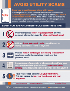 Please visit the FTC’s site for more information on National Consumer Protection Week and avoiding scams. For more information on how utilities across the country have partnered together to protect their customers from fraud, visit utilitiesunited.org. If you would like access to free electrical safety materials you can share throughout your community, visit esfi.org.