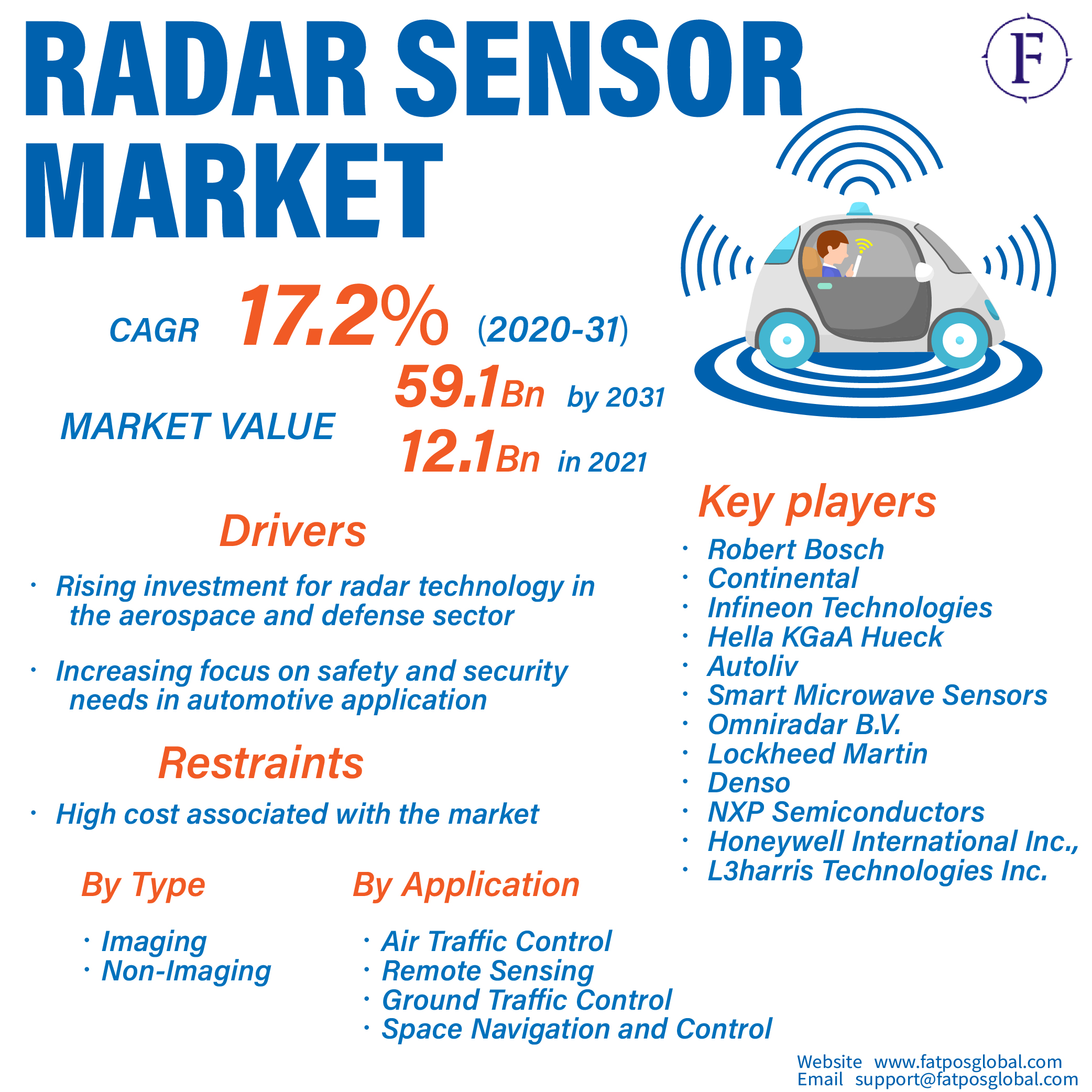 PHILADELPHIA, UNITED STATES , March 4, 2022 /EINPresswire.com/ -- Fatpos Global has released a report titled “Radar sensor market - Analysis of Market Size, Share & Trends for 2014 – 2021 and Forecasts to 2031” which is anticipated to reach USD 59.1 billion by 2031. According to a study by Fatpos Global, the market is anticipated to portray a CAGR of 17.2% between 2021 and 2031. According to the report, the major factor contributing to the growth of the RADAR sensors market are rising focus on safety and security needs in an automotive application, unlocking the wideband 5G and millimeter wave-based RF system capabilities, and the increasing requirement for border security systems. Now technology become more advanced and focuses on safety and security requirements in different applications such as vehicle collision assistance, industrial and public safety, and robotic assistance which, in turn, is expected to increase the demand over the coming years.
