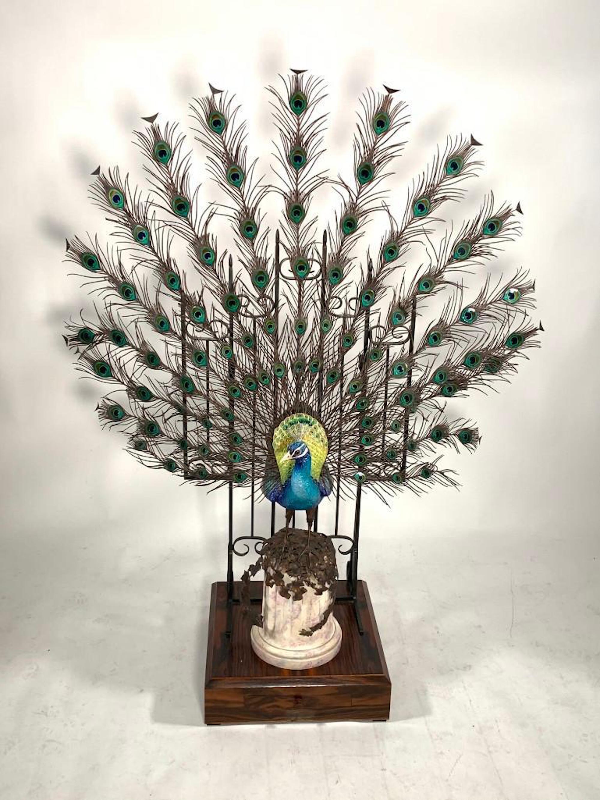 Two of the more visually dazzling items in the sale were a bronze kinetic sculpture by Bill Keating (American, b. 1932), titled Dancer, 24 ½ inches tall, signed and dated 1990, with the original sale receipt and brochure ($11,685); and a spectacular Albany of England porcelain, bronze and enamel peacock on a stand, 60 inches in height, the bronze bird brightly glazed in turquoise, cobalt blue and lime green, and the tail spread with fully articulated feathers ($5,842).