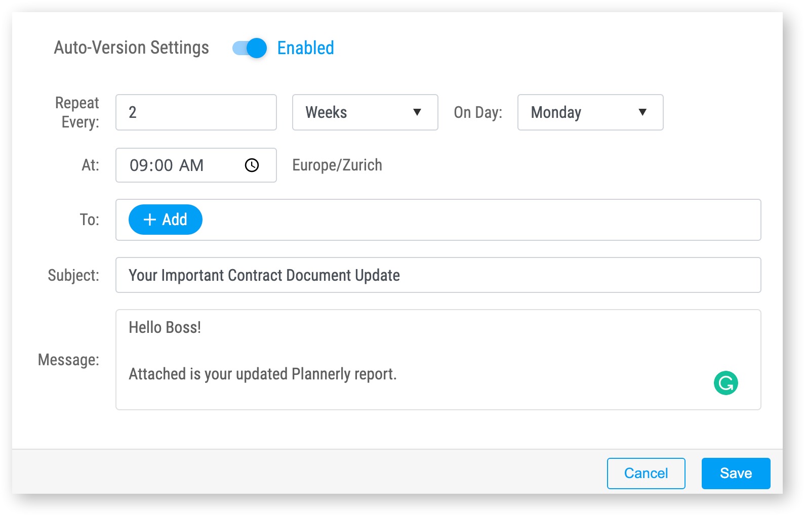 Plannerly's new Auto-Versioning automatically creates formatted PDFs from portions of the live document that are sent to your teams automatically via email.