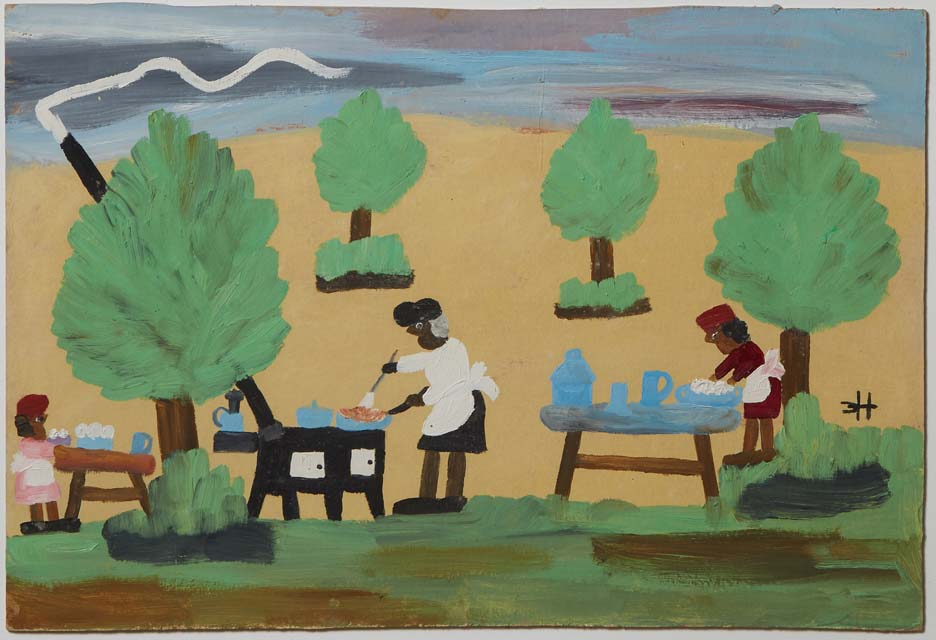 Oil on board painting by Clementine Hunter (La., 1887-1987), titled Fish Fry, a wonderful example of the artist’s work, 16 inches by 24 inches, artist signed (est. $4,000-$8,000).