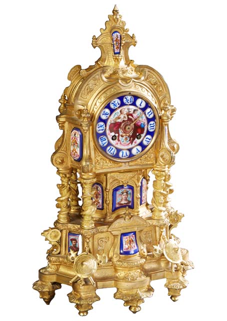 Gorgeous 19th century M. T. Kaltenberger gilt bronze and porcelain mantel clock, 17 inches tall (est. $800-$1,200).
