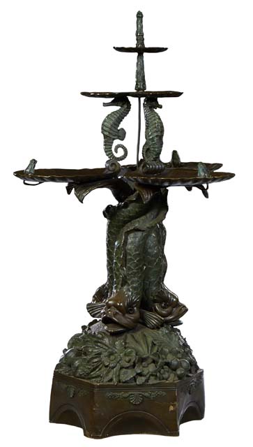 An unusual and striking patinated bronze seahorse fountain figure, made in either the 20th or 21st century, 67 inches tall by 36 ½ inches wide, should bring $5,000-$7,000. Also, a 20th century patinated bronze on a stepped oval verde antico marble plinth after Charles Valton (French, 1851-1918), titled Hunting Dogs, overall 18 ½ inches, is estimated to command $700-$1,200.
