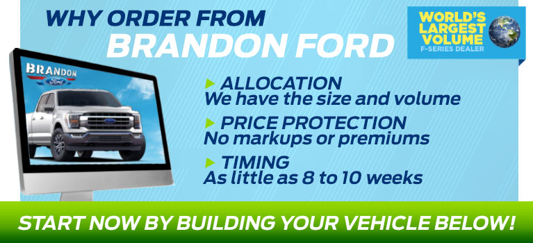 “We’ve been taking verified retail orders from customers all over the country. And since we have the allocation to get these vehicles built, we’ve seen many arrive to the dealership in an expedited fashion, on an average basis as little as 8- 12 weeks from the order date. Our knowledgeable team works with customers to make sure they know what options are readily available, and we are committed to not adding additional markups or premiums to the MSRP. Customers can save big, shield themselves from market pricing, and maximize the crazy trade-in values we are able to provide right now," said Murray of Brandon Ford.