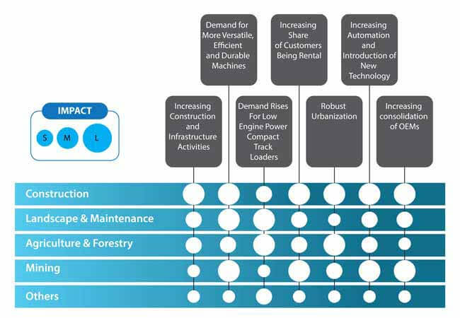 - Compact track loader market finds extensive application across areas such as construction, landscape and maintenance, agriculture and forestry, mining, and others.