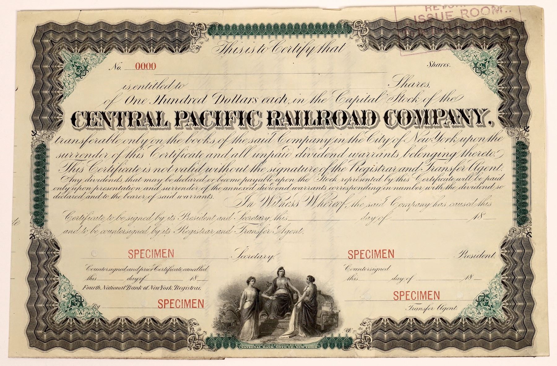 Scarce, 19th century Central Pacific Railroad (Calif.) specimen stock certificate for $100 par shares, with a vignette at the bottom of three allegorical females ($750).