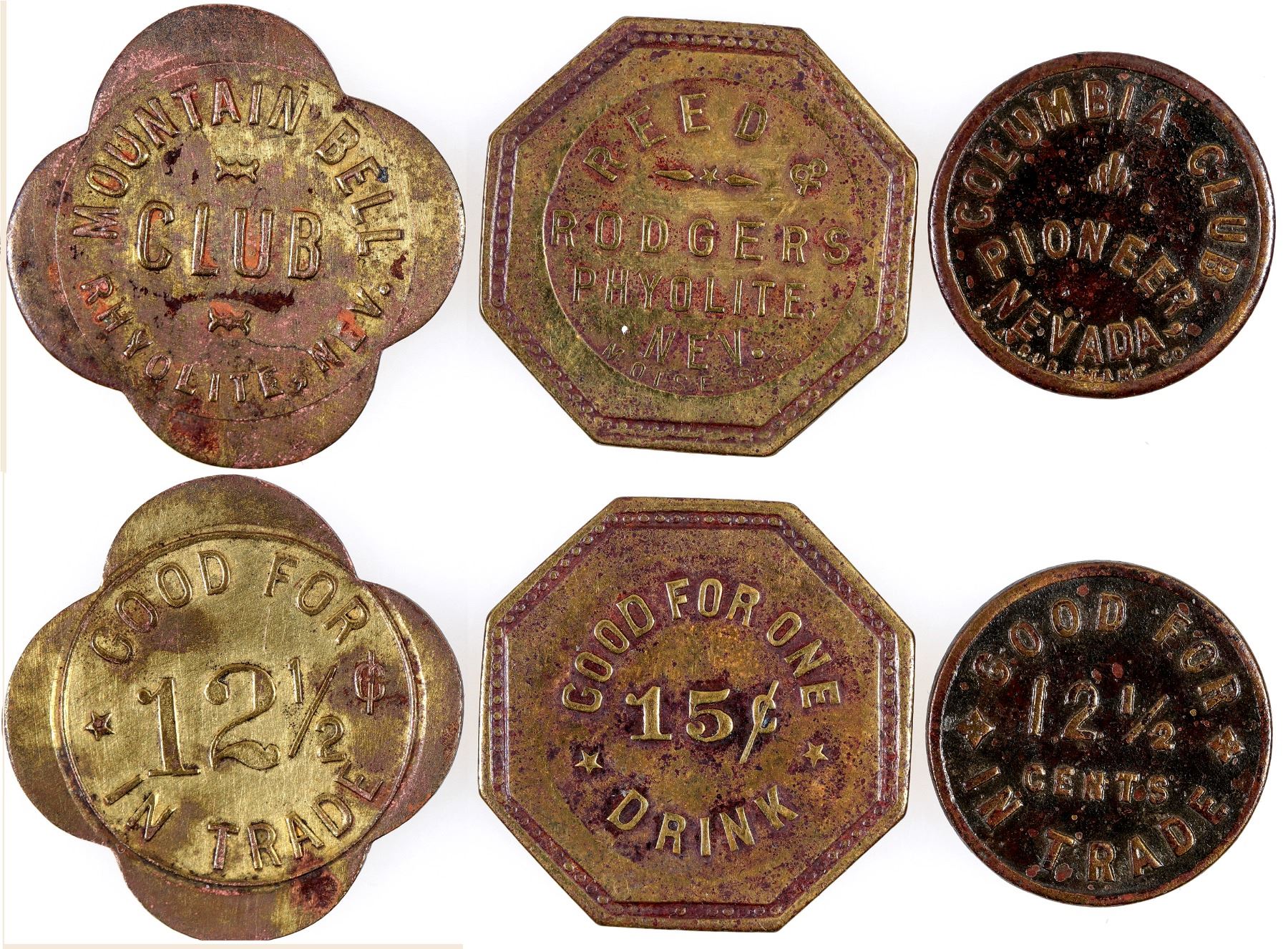 A collection of 35 brilliant uncirculated Benjamin Franklin half-dollar coins, dated 1948-1963 and housed in a Capital Plastics holder, went for $1,438; a lot of three rare tokens from the Bullfrog, Nevada mining district (example: “Mountain Bell Club, Rhyolite, Nev., Good for 12.5 Cents in Trade”), changed hands for $2,250; and a Carson City (Nev.) U.S. Mint canvas bag, 19 inches tall, brought $2,125. The mint used silver from the nearby Comstock Lode mining district.