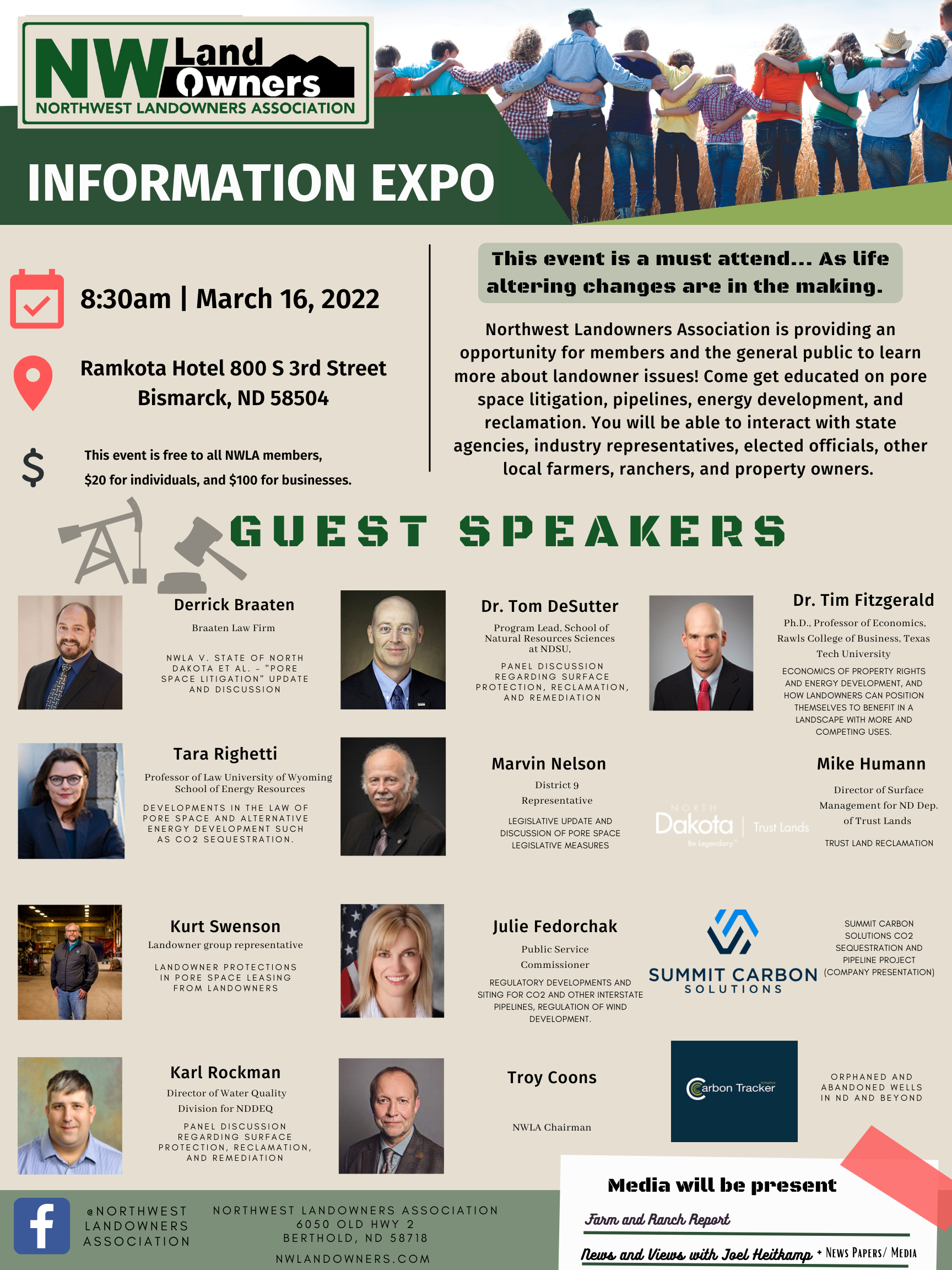 BISMARCK , ND , USA, March 10, 2022 /EINPresswire.com/ -- Northwest Landowners Association will be hosting an Information Expo on March 16th as an opportunity for its members and general public to learn more about landowner issues and how to protect their property rights. Our hope is that these North Dakota farmers and ranchers will have the opportunity to meet and talk to representatives from state agencies, world redound guest speakers, and elected officials.Some topics you can expect to hear are, economics of property rights, energy development, how landowners can position themselves to benefit in a landscape with more and competing uses, pore space litigation, law development, surface reclamation, Summit Carbon Solutions, landowner protections, alternative energy, regulatory development, orphaned and abandoned wells, and more.