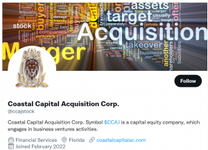 Coastal Capital Acquisitions Corporation (CCAJ)’s official Twitter handle (@ccajstock) is now live.