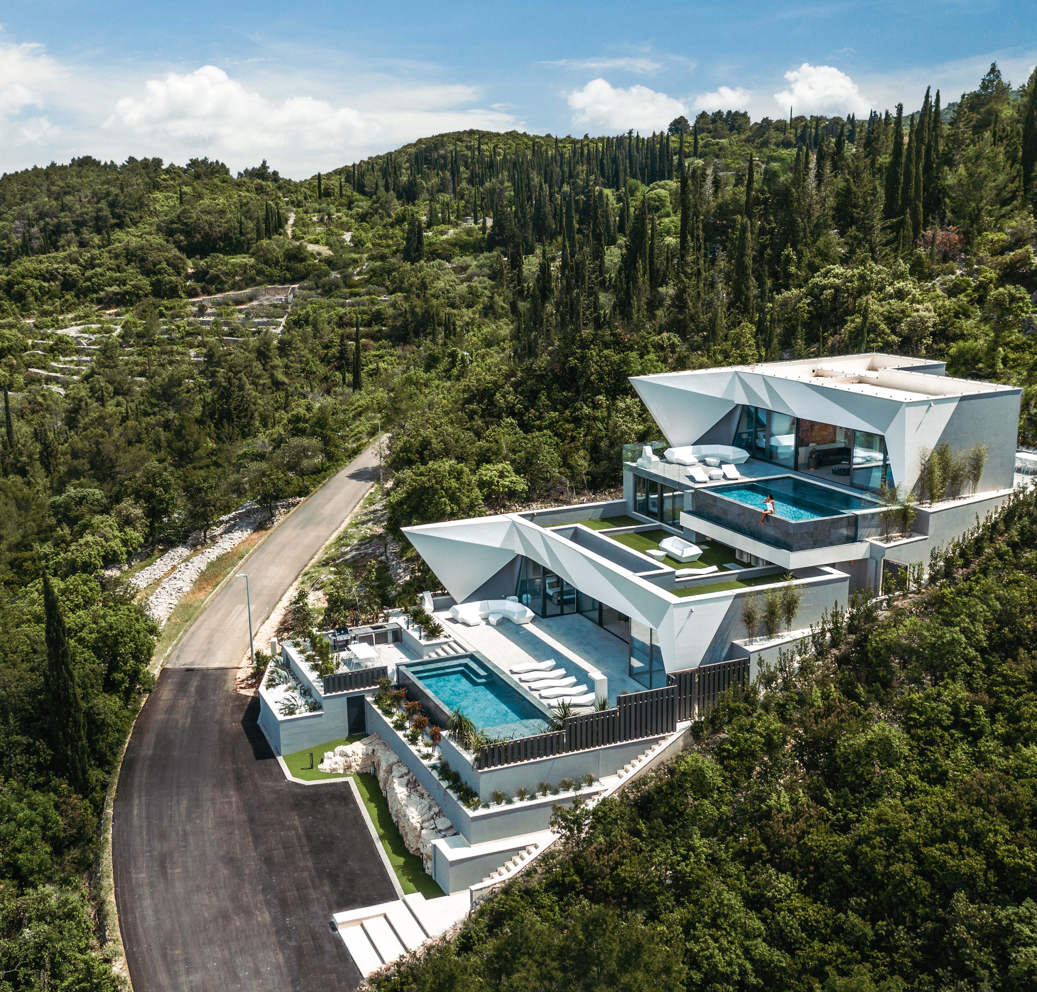 This stunning villa compound arises seemingly out of the rolling hills. Its contemporary architecture sets it apart, yet the minimalist, indoor-outdoor design blends seamlessly into its surroundings. Behind the gated entry, two luxurious villas span three levels, giving you and your guests the utmost privacy. Walls of glass open to the terrace for incredible flow and grand entertaining overlooking the Adriatic. The multi-level terrace offers two infinity-edge pools and spaces to please every mood. Two outdoor barbecue areas and dining areas anchor your hosting needs. One is an intimate space surrounded by trees and Croatian limestone; the other is open to the expansive sea and countryside views and can accommodate a crowd. Survey the entirety of the estate from your stunning top-floor owner’s retreat. Enjoy the coastline view from your private terrace or sink into a refreshing soak in your open-air spa bath. Additional features include: sleek cabinetry; minimalist design; designer appliances; an island with bar seating; an owners suite with walls of glass; a private terrace; a spa bath with an alfresco soaking tub; two outdoor barbecue areas with dining and lounge areas—all just a 3-minute drive from the center of Korčula and 3.8km to the catamaran ferry (Split or Dubrovnik).
