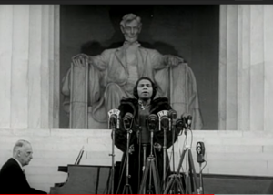 Marion Anderson singing at the Lincoln Memorial after being denied the opportunity to sing at the Daughters of the American Revolution, due to her being African-American.