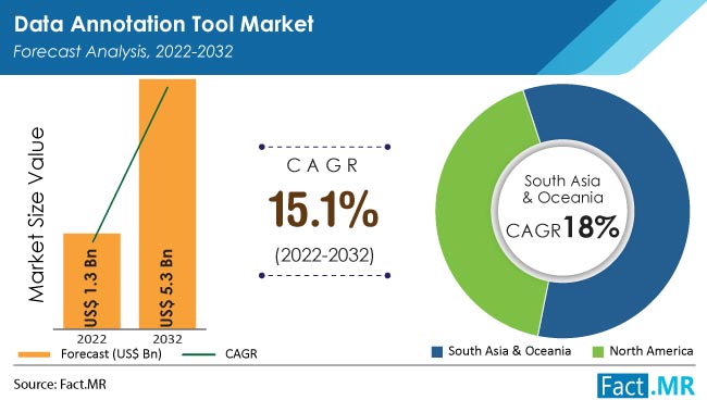 The global data annotation tools market is anticipated to expand at a CAGR of 15.1% during the forecast period from 2022-2032. The market is expected to be valued at US$ 1.3 Bn by 2022-end, and is expected to reach US$ 5.3 Bn by 2032.