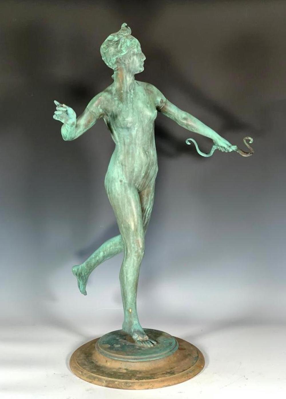 One of two bronzes statues with green verdigris patina signed by William MacMonnies (American, 1863-1937), this one titled Diana (1890), 31 in. tall (est. $10,000-$12,000).