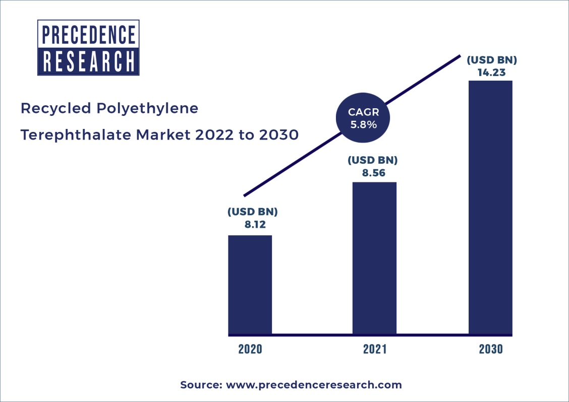 According to Precedence Research, the recycled polyethylene terephthalate market size is predicted to hit US$ 14.23 billion by 2030 and expanding growth at a CAGR of 5.8% from 2022 to 2030.