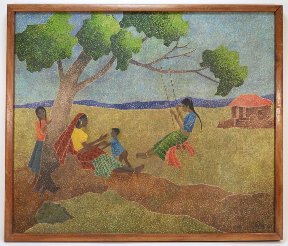 Oil on canvas outdoor genre painting by Narayan Shridhar Bendre (India, 1910-1992), nicely housed in a 31 ¼ inch by 36 ¾ inch frame and artist signed (est. $40,000-$50,000).