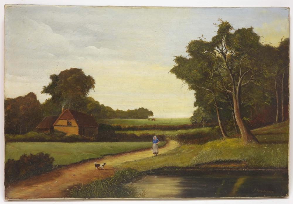 The oil on canvas farm landscape by Joseph Farquharson is 20 ¼ inches by 29 ¾ inches and depicts a woman and her dog standing in the middle of a winding dirt road leading towards a cattle field beside a small home. The work is signed “J Farquharson” lower right and should fetch $8,000-$12,000. Farquharson frequently included a human figure in his work to demonstrate the scale, and sometimes the severity, of the surrounding landscapes.