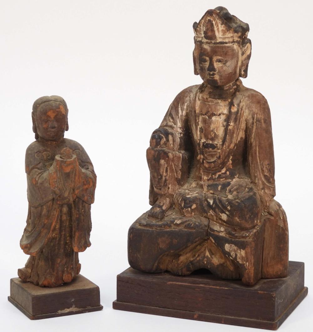 A pair of Chinese carved wood figures from the late Ming or early Qing Dynasty should change hands for $500-$800. The figures, one 5 ¾ inches tall and the other 8 inches tall, consist of a carved Guan-Yin dressed in a flowing robe carrying a bowl and holding a single peach, and a figure dressed in flowing robes with one hand touching the ground.