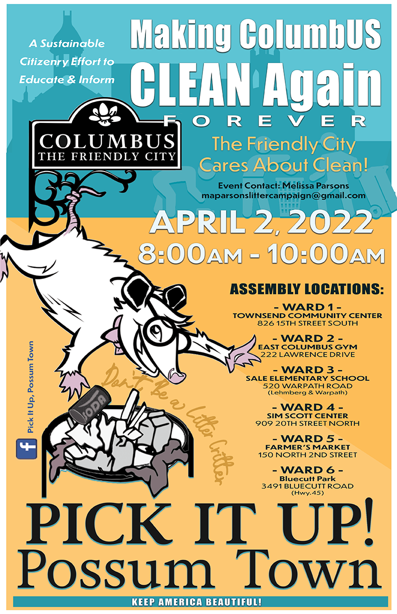 The latest Pick It Up! Possum Town information is available on its Facebook page (www.facebook.com/pickituppossumtown), the City of Columbus, MS-Mayor’s Office Facebook page (www.facebook.com/CityofColumbusMS), and the City of Columbus Website (www.thecityofcolumbusms.org). Our immediate need is for volunteers to pick up litter in their Wards on April 2nd or at their homes and neighborhoods, distribute flyers, and like and share the Pick It Up! Possum Town Facebook pages.