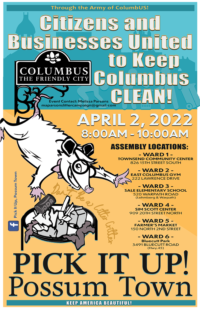 Pick It Up! Possum Town assembly and supply locations are the Townsend Community Center at 826 15th Street South in Ward 1, the East Columbus Gym at 222 Lawrence Drive in Ward 2, Sale Elementary School at 520 Warpath Road in Ward 3, the Sim Scott Center at 909 20th Street North in Ward 4, the Farmer’s Market at 150 North 2nd Street in Ward 5, and Bluecutt Park at 3491 Bluecutt Road in Ward 6. Additionally, Columbus residents and business owners who can’t attend a Ward clean-up are encouraged to Pick It Up! at home and in their neighborhood and post before and after images of their clean-up activities on Facebook.