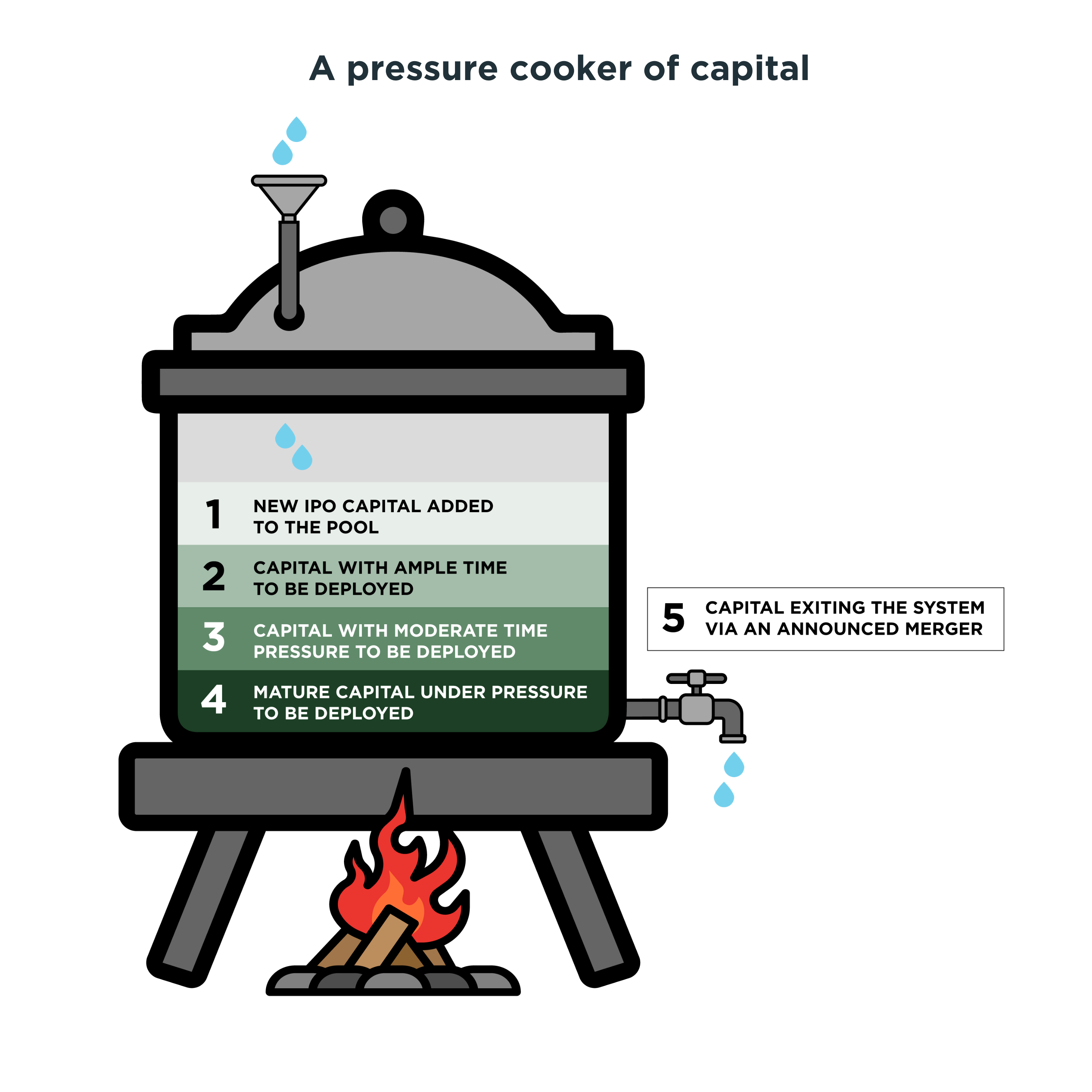 At the top of the pressure cooker is brand new capital from SPAC IPOs. This new capital adds to the existing layers of capital inside the system, the middle layers of the pressure cooker -- capital with ample or moderate time to deploy. At the bottom of the pressure cooker of capital, closest to the fire, is where the most pressure builds. This mature capital under pressure is urgently looking for deals, as the SPACs get close to their maturity dates. Pressure in the system is released when SPACs announce a deal and deploy their capital through a merger or when they unwind and return capital to investors.