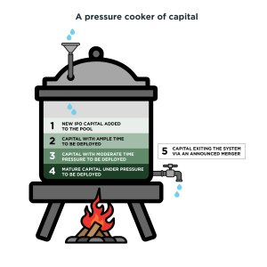 We visualize this pool of capital as if within a “pressure cooker” representing the total amount of capital that has entered from SPAC IPOs, placed under pressure based on the deadline to find a merger partner and de-SPAC.