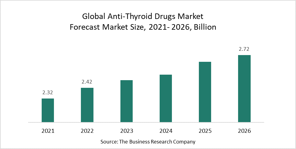 The global anti-thyroid drugs market size is expected to grow from $2.32 billion in 2021 to $2.42 billion in 2022 at a compound annual growth rate (CAGR) of 4.4%. The growth in the anti-thyroid drugs market is mainly due to the companies rearranging their operations and recovering from the COVID-19 impact, which had earlier led to restrictive containment measures involving social distancing, remote working, and the closure of commercial activities that resulted in operational challenges. The global anti-thyroid drugs market share is expected to reach $2.72 billion in 2026 at a CAGR of 3.0%.