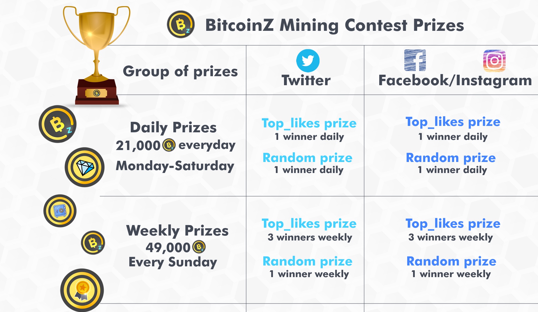 All the rewards are already mined coins of the Community's Fund since BitcoinZ had no premine & 100% fair rules, making these prizes even more meaningful.