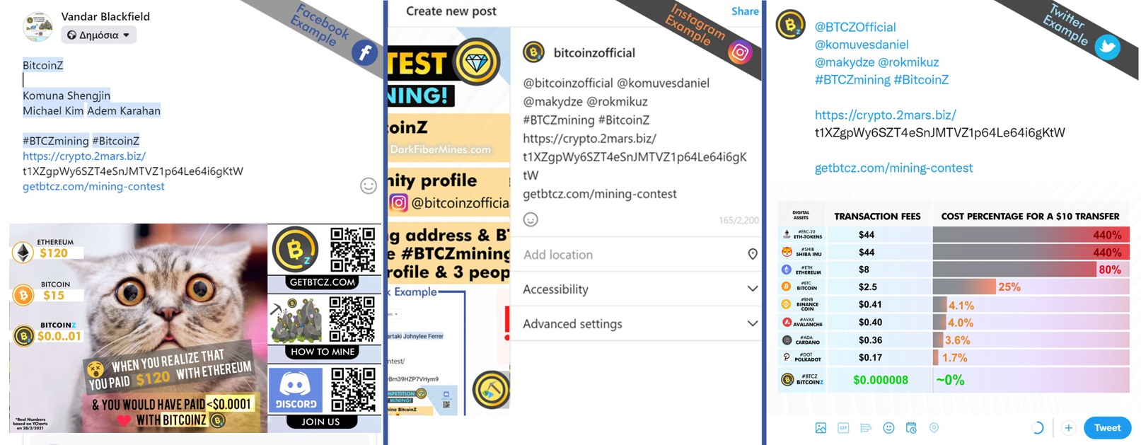 2) Make a post in the social media of his choice, tagging the relevant BitcoinZ Community's profile (which he/she must follow) & 3 people