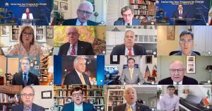 clockwise from bottom left, Hon. Michael Mukasey, 81st U.S. Attorney General, Mr. Jonathan Ruhe, Amb. Mitchell Reiss, General (ret) Chuck Wald & Former NJ Senator Robert Torricelli, discuss the Iranian regime nuclear ambitions, during March 25, 2022 NCRIUS conference.