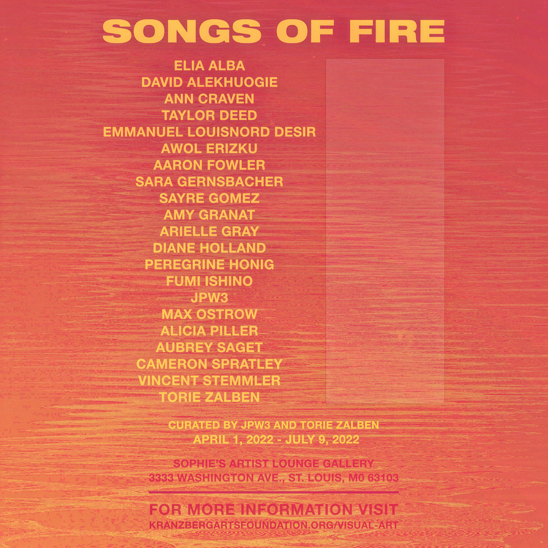 Songs of Fire Art Event Curated by artists JPW3 & Torie Zalben April 1 July 9, 2022 Group art exhibition that brings together 21 American artists in St. Louis