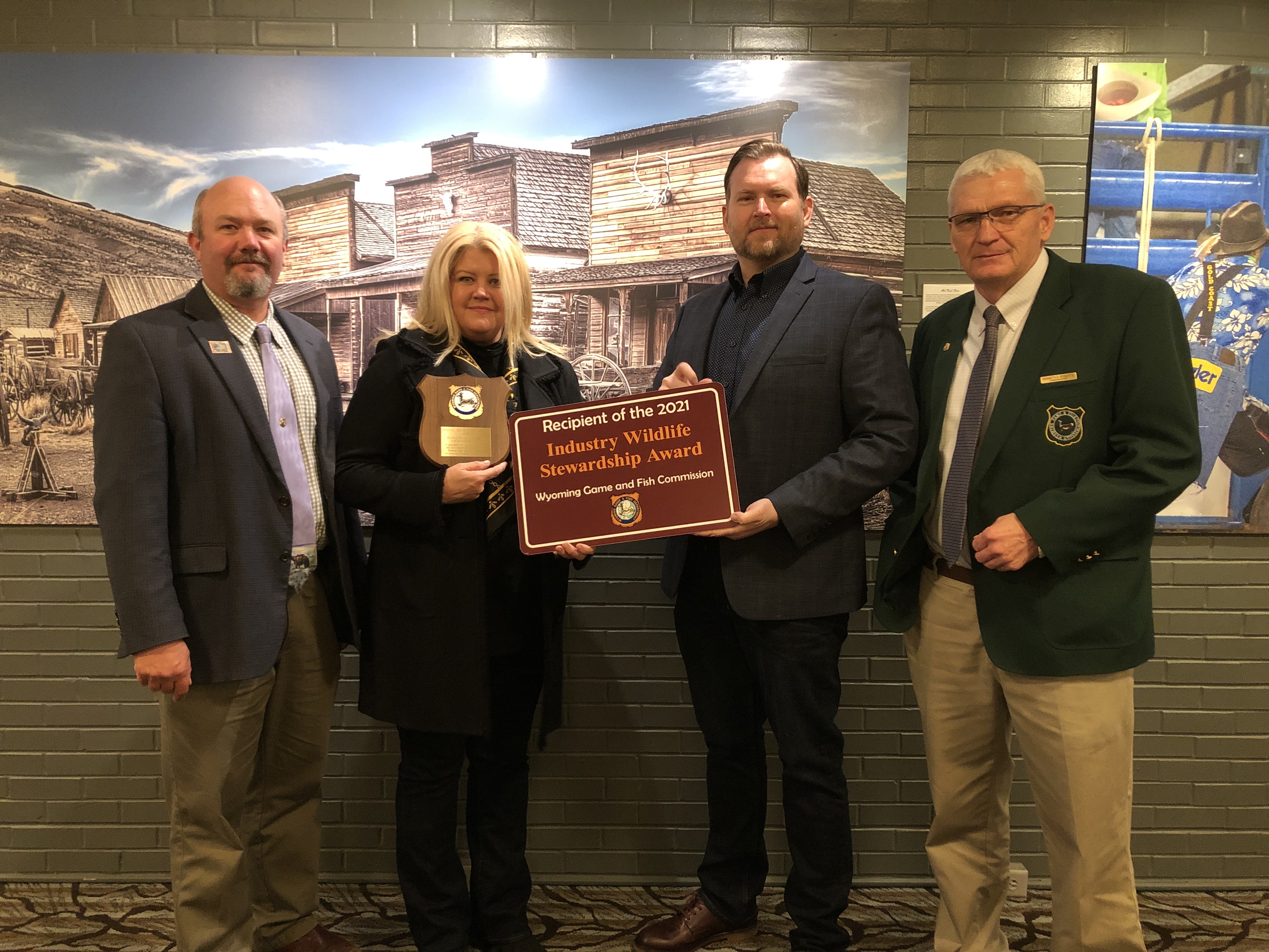 Photo, left to right: Brian Nesvik, director of Game and Fish; Sharon Fain, Rocky Mountain Power vice president for Wyoming; Travis Brown, PacifiCorp director of Wind Compliance and Permitting; and Ken Robert, Game and Fish Commission president.