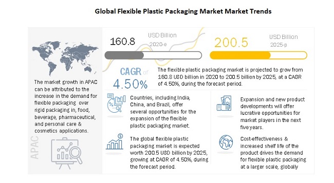 PUNE, MAHARASHTRA, INDIA, March 30, 2022 /EINPresswire.com/ -- The report "Flexible Plastic Packaging Market by Type (Pouches, Rollstocks, Bags, Wraps), Material (Plastic & Aluminum Foil), Application (Food, Beverage, Pharma & Healthcare, Personal care & Cosmetics), Technology, and Region – Global Forecast To 2025", The global flexible plastic packaging market size is projected to grow from USD 160.8 billion in 2020 to USD 200.5 billion by 2025, at a CAGR of 4.5% from 2020 to 2025. The market is projected to grow in accordance with the increase in the demand for flexible plastic packaging for food, beverage, and cosmetics products across the globe. Furthermore, the flexible plastic packaging market has witnessed a significant increase in its demand for the supply of grocery, drugs, and vegetables & meat through online channels, during the ongoing COVID-19 pandemic.