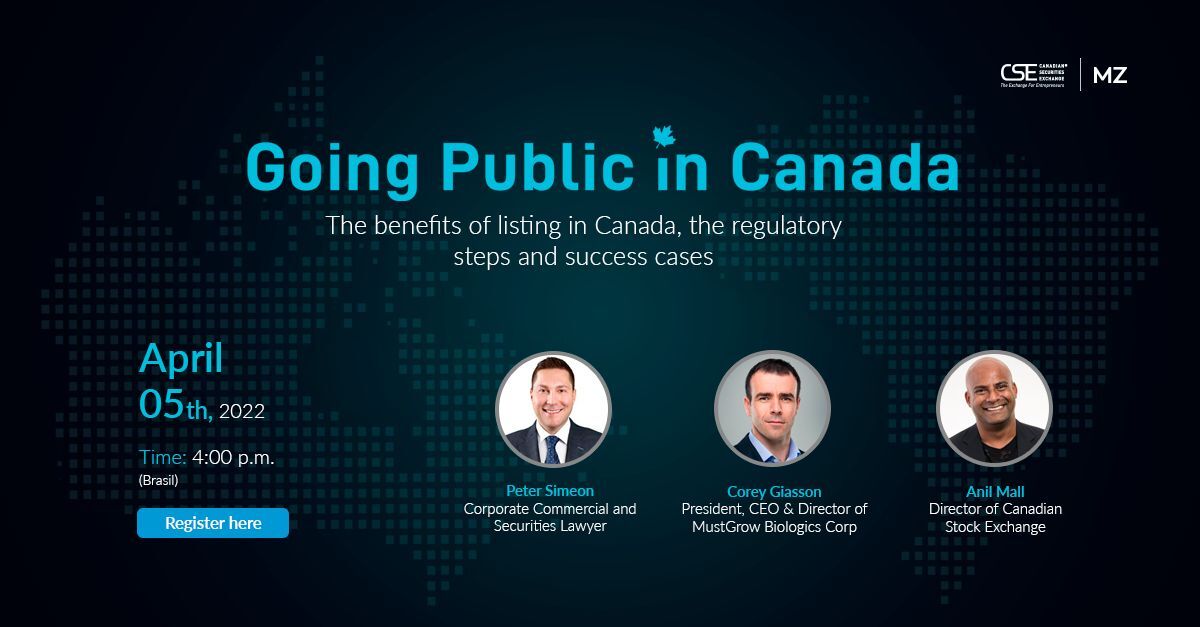 SãO PAULO, SãO PAULO, BRAZIL, April 5, 2022 /EINPresswire.com/ -- Broadcast live, the event will feature options to go public on the Canadian Securities ExchangeLeader in investor relations solutions, MZ will promote the first edition of the Canada Day on April 05, at 4:00 p.m. Held in partnership with the Canadian Securities Exchange (CSE), the event aims to introduce investments options on the Canadian stock exchange to Brazilian investors. Broadcast live through the MZ Portal, the event will be attended by Barrington Miller, CSE’s Director; Peter Simeon, Corporate Commercial and Securities Lawyer; and Corey Giasson, President and CEO of MustGrow Biologics Corp.