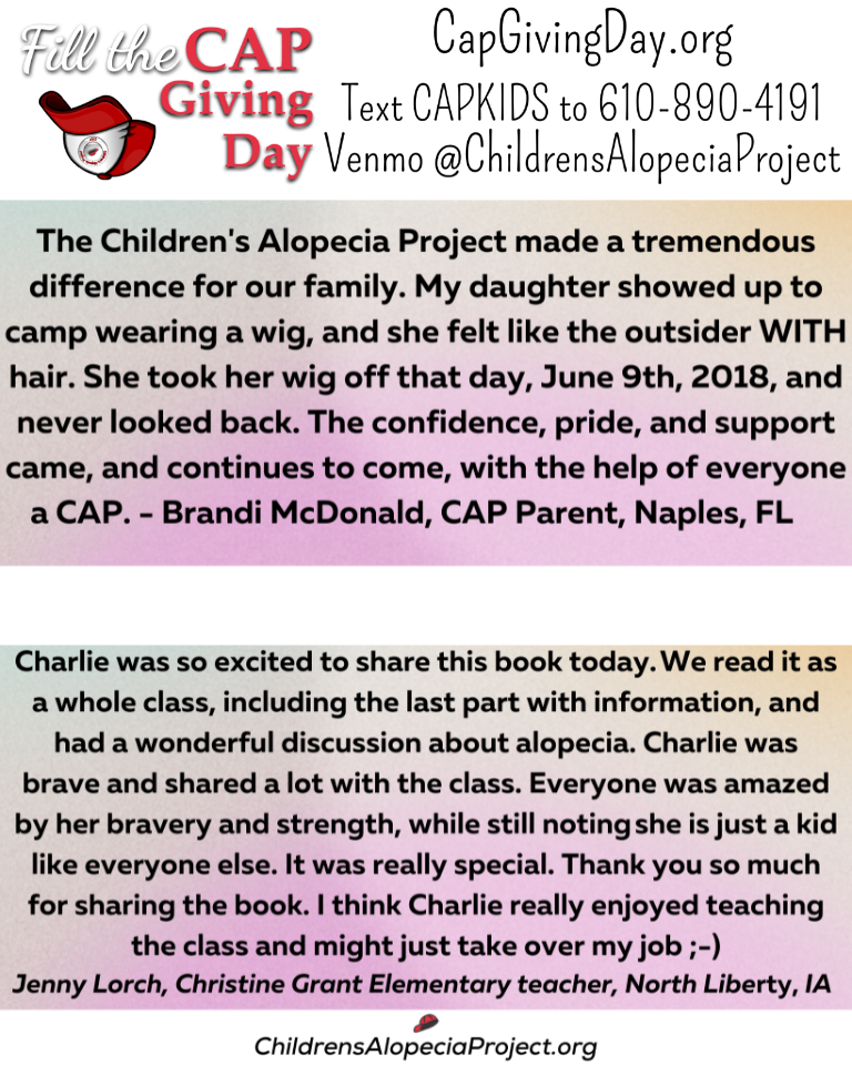 WYOMISSING, PA, UNITED STATES, April 6, 2022 /EINPresswire.com/ -- "Fill the CAP" April 14th, "Children with Alopecia Day". "Fill the CAP Giving Day" is a fundraiser helping to ensure that we keep kids with alopecia and their siblings under 6, free, at all Cap Kid Camps and Alopeciapalooza. Visit CapGivingDay.org, Venmo @ChildrensAlopeciaProject, or Text CAPKIDS to 610-890-4191. Thank you all, I truly appreciate your support and love in helping CAP Kids and their families. #TEAMCAP #FilltheCapGivingDay #ChildrensAlopeciaProject #CAPKids