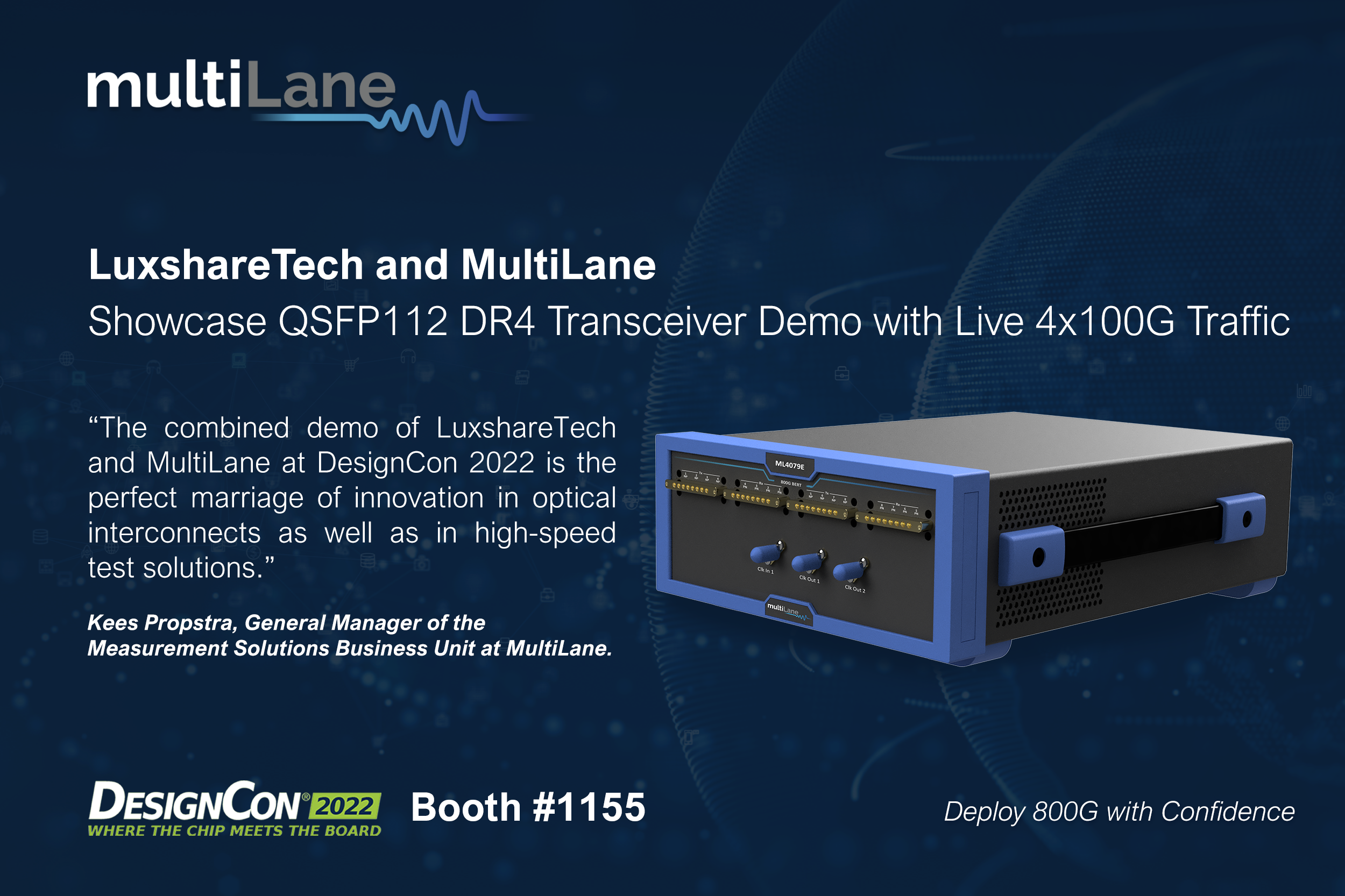 SANTA CLARA, CALIFORNIA, USA, April 6, 2022 /EINPresswire.com/ -- Innovations in the high-speed space are on full display as DesignCon 2022 kicks off in Santa Clara, California this week. To that effect, LuxshareTech (booth #839) and MultiLane (booth #1155) announced today a successful live demonstration of a QSFP112 silicon photonics DR4 optical transceiver driven by the MultiLane ML4079E 8x100G Bit Error Rate Test (BERT) platform. 100G-per-lane signal transmission is emerging as an increasingly mature and versatile technology, as showcased by the new LuxshareTech QSFP112 DR4 module transmitting and receiving traffic in real time at 400Gbps. Novel optical interconnects like QSFP112 enable seamless line side interoperability with modern optics like QSFP28 DR1, QSFP-DD DR4, and OSFP DR4, already deployed at scale in optical networks all around the world.
