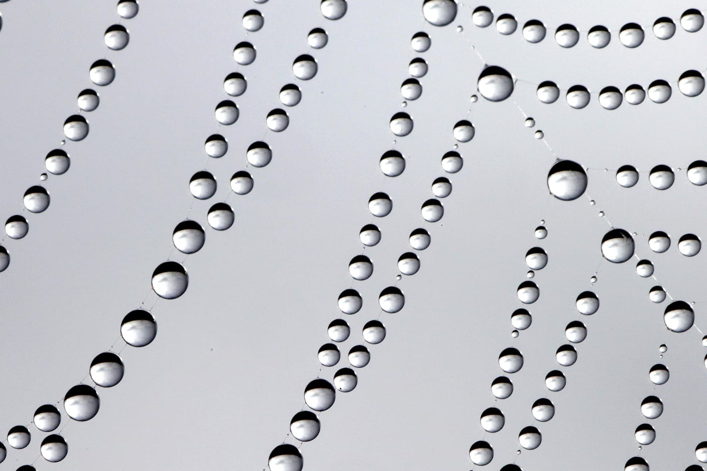 En Drops Cacciaguerra explora la interacción entre el rocío y la telaraña, donde se forman gotas de agua con patrones fantásticos, que varían desde construcciones de apariencia cuasi ingenieriles, hasta un fino encaje. Cacciaguerra se maravilla ante la perfección creada en estos encuentros naturales y su trabajo comunica esta sensación de asombro.