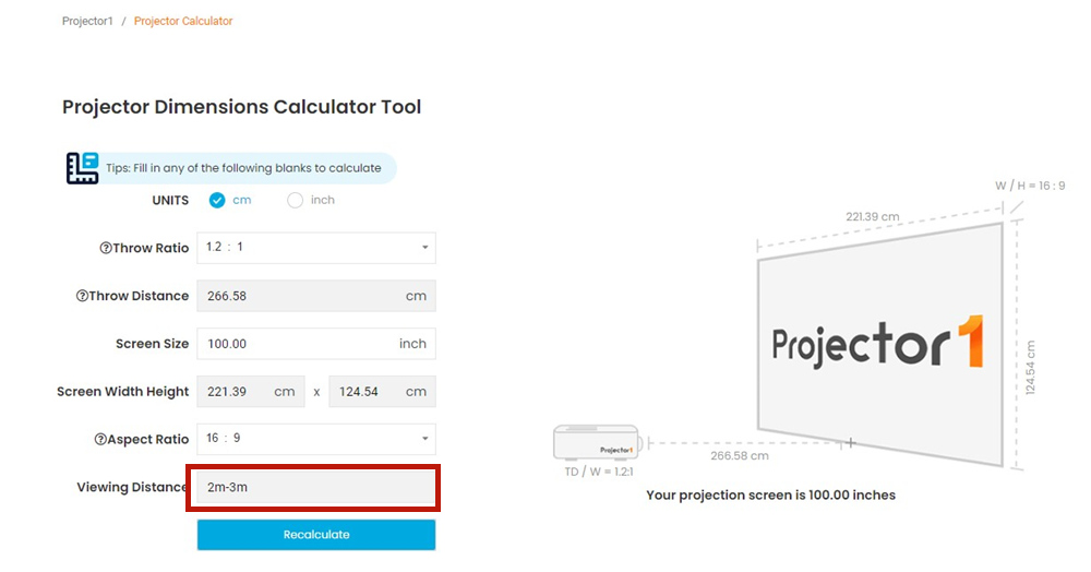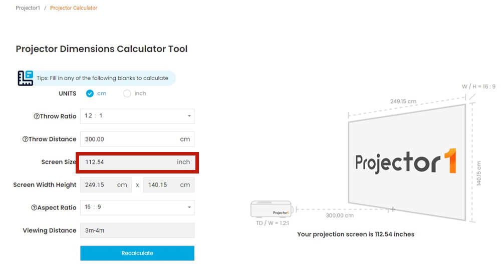 NEW TORK, US, April 19, 2022 /EINPresswire.com/ -- Projector1 (a professional website specializing in projectors) has updated its online projector calculator tool recently.For projector beginners, the first problem before or after buying a projector is to set up the projector. For example, before buying a projector, they don’t know whether the projection size is suitable for the room and also don’t know the proper screen size; for another example, they don’t know where to place the projector to fit the screen, they don’t know where is the best viewing distance.