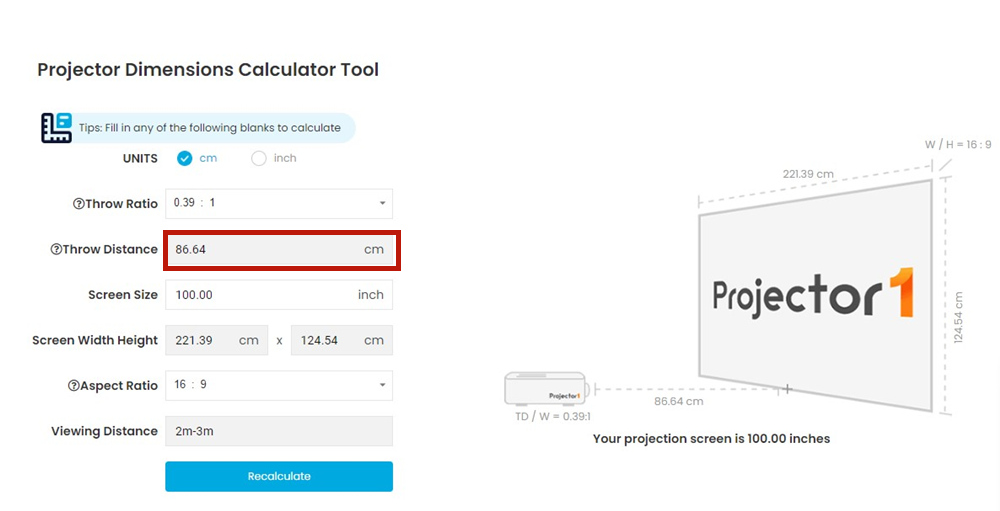 Selecting Throw Ratio of 0.39:1 in the 1st blank, and filling in the Screen Size with 100 in the 3rd blank.