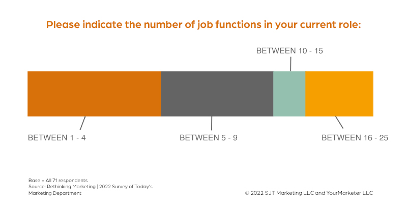 The survey found that 34% of 71 respondents were responsible for roles outside the marketing department, in addition to their marketing job, which caused inefficiency in resource use around finding and building a loyal client base. 59% of marketers are handling over 5 core job responsibilities, making it difficult to maintain high level performance and meet the expectations of key stakeholders.