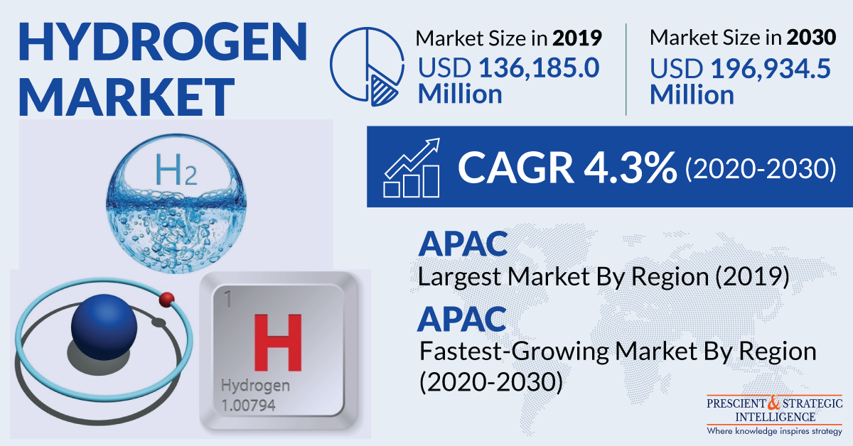 NEW YORK, UNITED STATES, April 26, 2022 /EINPresswire.com/ -- From $136,185.0 million in 2019, the hydrogen market is expected to demonstrate a CAGR of 4.3% during 2020–2030, to reach $196,934.5 million by 2030, according to the market research firm P&S Intelligence. The major drivers for the industry are the increasing use of ammonia-based fertilizers for enhancing the farm productivity. The growing demand for hydrogen in the refining industry, due to the strict norms for reducing the sulfur content in crude oil, is also helping the market boom. Another application of the gas that is being extensively experimented upon is fuel cells for automobiles.A key driver for the hydrogen market is the increasing utilization of the gas in the refining industry. It is used for cracking long-chain hydrocarbons into shorter-chain variants and removing sulfur from crude oil while producing gasoline. The growing production of heavier crude oil is raising the demand for hydrogen because heavier crude oil requires extensive processing. In addition, governments have set strict rules for minimizing the sulfur content in the oil, which is driving the consumption of this gas.