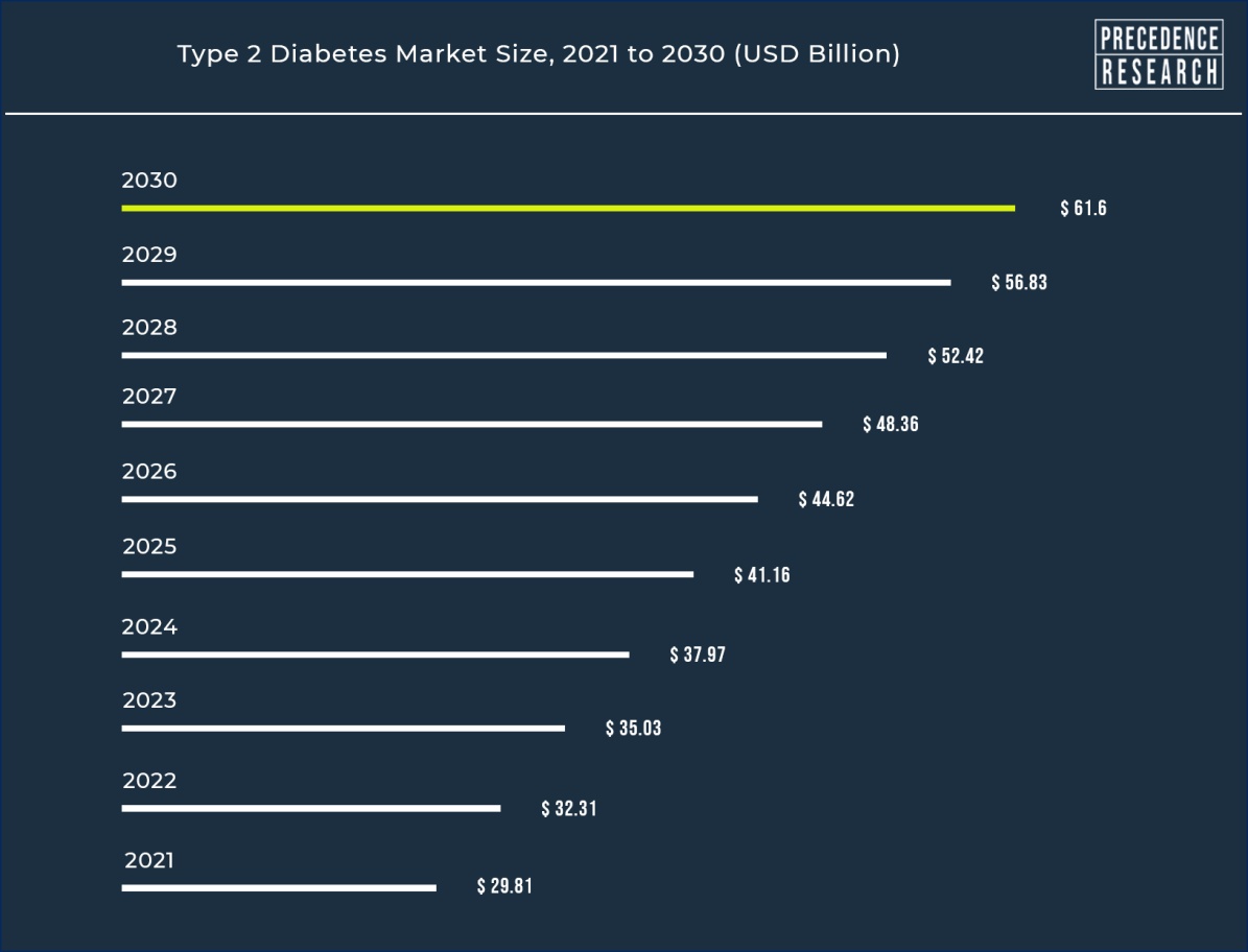 According to Precedence Research, the global type 2 diabetes market was estimated at US$ 29.81 billion in 2021 and is projected to worth around US$ 61.6 billion by 2030, growing at a CAGR of 8.4% from 2022 to 2030.