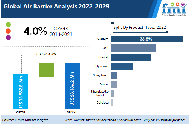 Future Market Insights (FMI), in its new report, brings to fore an even-handed analysis of the global air barrier market, offering comprehensive information with historical demand data for 2014-2021, and forecast statistics for 2022-2029. The research study offers insightful aspects of the global air barrier market based on various categories such product type (gypsum, drywall, plywood, OSB, spray foam, fiberglass, cellulose, others), type (membranes, coatings, stacking & filling), site (external, internal), application (corrosion resistance, insulation, material packaging & stacking, microbial & fungal resistance), end use (residential, commercial, industrial facilities, car parks, military building, green house/ metal building) and region (North America, Latin America, Europe, MEA, South Asia, East Asia and Oceania).