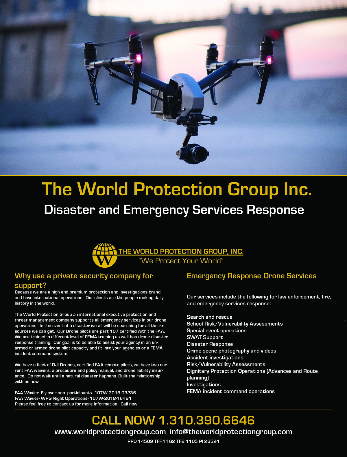 The World Protection Group (WPG) offers full-service executive protection both in the U.S. and internationally, providing the most robust protection and threat management services through intelligence and an emphasis on proactive and preventive protection. Founded in 2001 by Kent Moyer and headquartered in Beverly Hills, California, WPG also has offices in Mexico City/Mexico, Shanghai/China, and Okinawa/Japan. WPG has been at the forefront of innovation in the Executive/Dignitary protection industry for the past twenty-one years. As the leading company in the industry to use and integrate drones into our security & emergency operations, WPG is the only US-based security company with four FAA drone waivers and airspace authorizations for the entire Los Angeles County.
