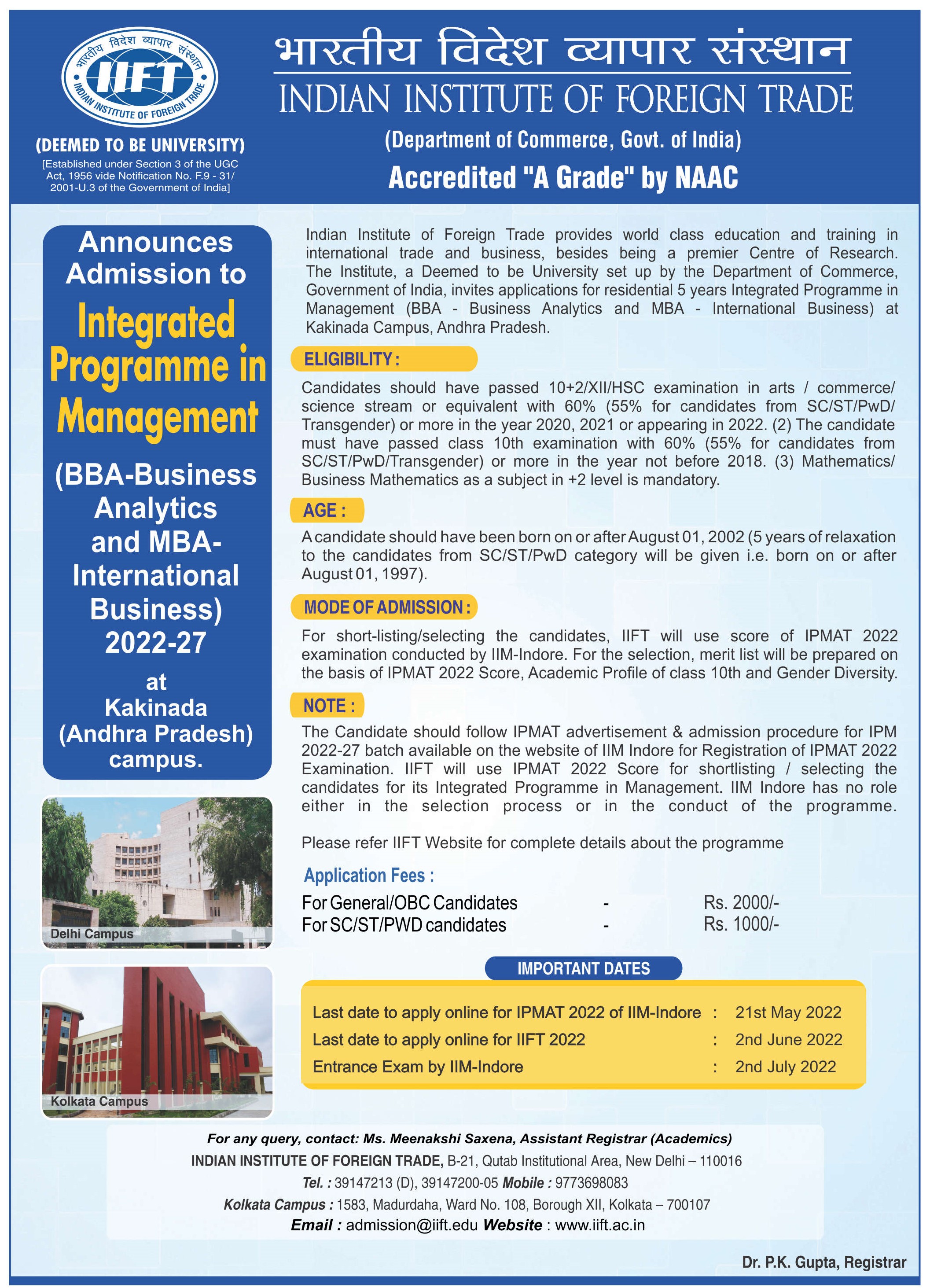 • The Candidate should follow IPMAT advertisement & admission procedure for IPM 2022-27 batch available on the website of IIM Indore for Registration of IPMAT 2022 Examination. IIFT will use IPMAT 2022 Score for shortlisting/selecting the candidates for its Integrated Programme in Management. IIM Indore has no role either in the selection process or in the conduct of the programme.