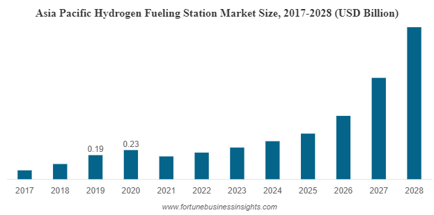 According to Fortune Business Insights, the global hydrogen fueling station market is projected to grow from USD 0.37 Billion in 2020 to USD 2.67 Billion in 2028, at CAGR of 30.8% during forecast period.