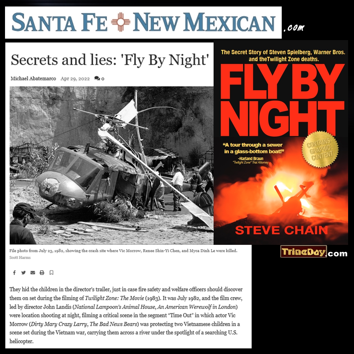“The same thing happened during the filming of TWILIGHT ZONE: THE MOVIE in 1982, the subject of my book, ‘Fly By Night: The Secret Story of Steven Spielberg, Warner Bros. and the Twilight Zone Deaths.’ A special effects explosion brought down a helicopter, which killed actor Vic Morrow and two children. My book shows how the director and the producers and the studio scrambled to cover up what happened,” Chain said.