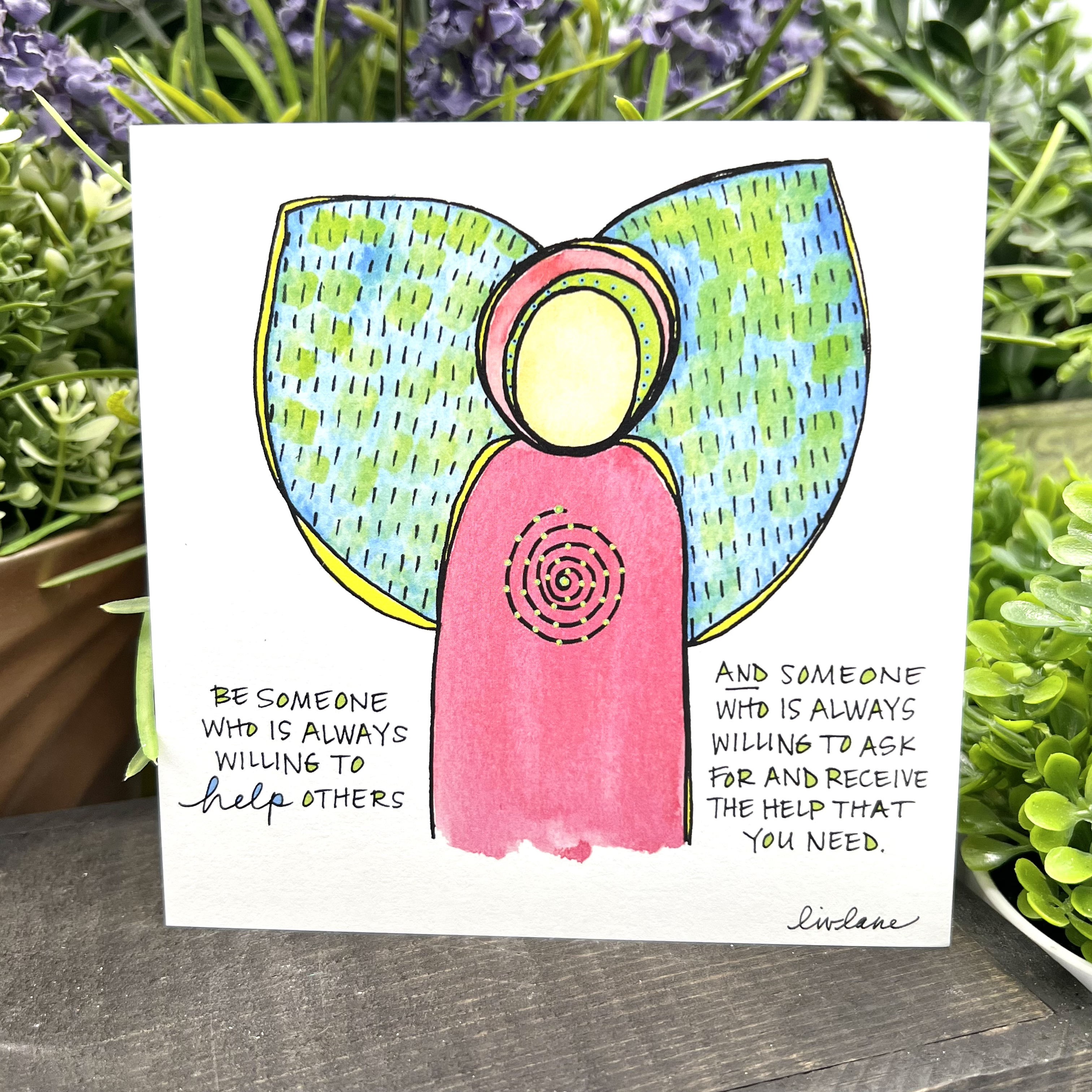 Each of the WingTips paintings features colorful, whimsical renderings of angels alongside their profound words of advice, handwritten by Lane, on how to be “a good and happy human.” The back of each art print features an in-depth explanation from the angels to build on that advice. Printed on sturdy, art-quality paper to encourage personal engagement, two of the sets include a wooden display easel to support a daily or weekly practice of reflection.