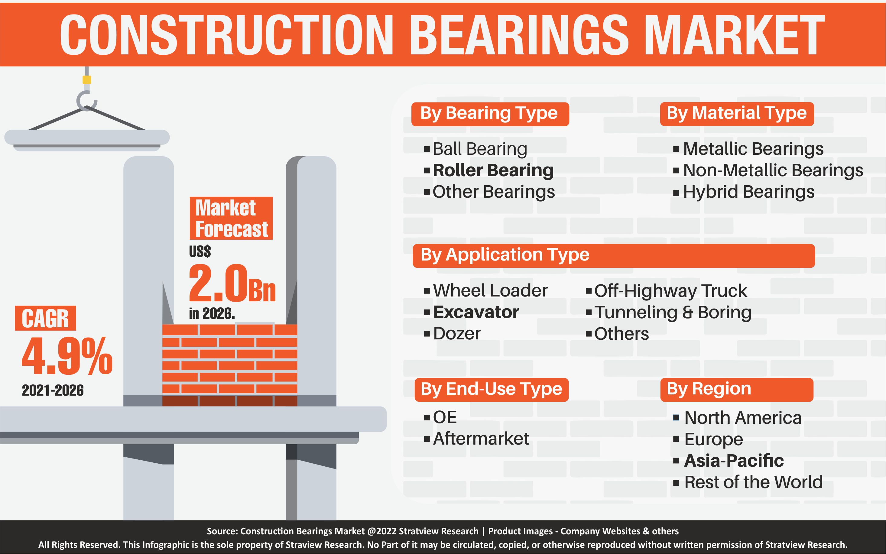 The Construction Bearing Market is expected to grow at a CAGR of 4.9% during 2021-2026 to reach the landmark figure of US$ 2.0 Billion in 2026; states Stratview Research.