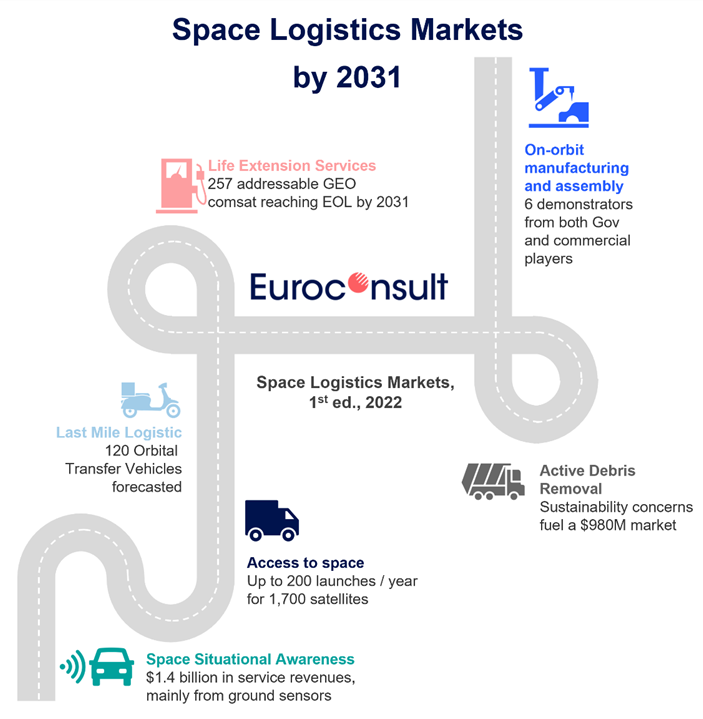 Driven by low-cost launches, a continuously growing satellite demand and a congested orbital environment, the space logistics markets are currently dominated by life extension services for satellites in-orbit and Space Situational Awareness services (SSA) which entails surveillance and tracking, weather monitoring and near-earth objects monitoring.
